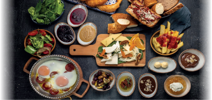 Çengelköy salatalik, Antakya kirik yesil zeytin, siyah zeytin, çeçil peyniri, kasar peyniri, Ezine beyaz peynir, ceviz