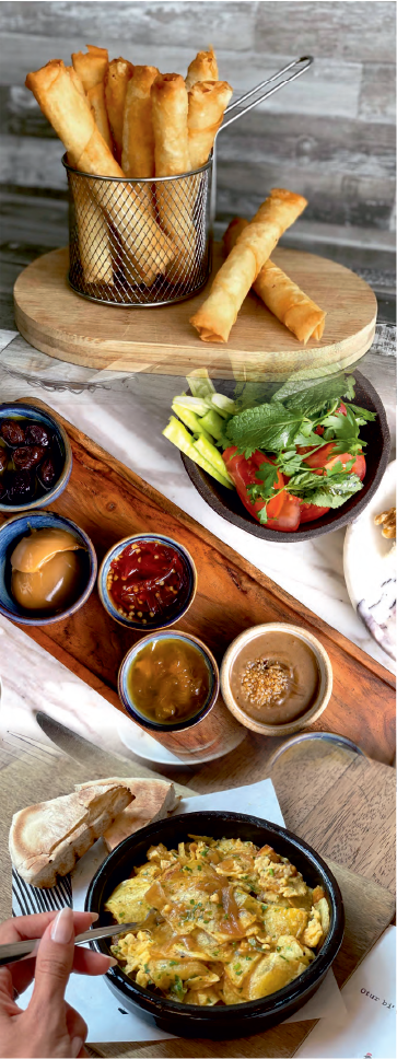Eksi mayali ekmek üzerine, sütlü cirpilmis yumurta, kizarmis hellim peyniri, domates, dana suck, dana jambon, su böregi.