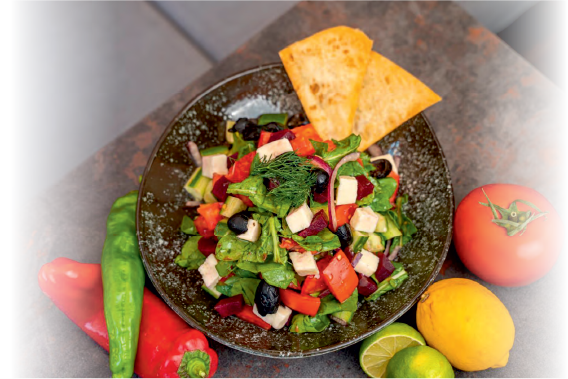 Söğüş domates, salatalık ve zeytin ile.